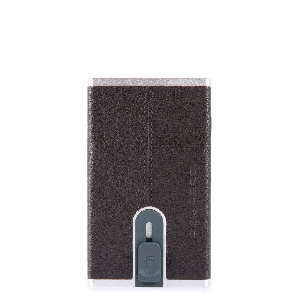 Porta carte di credito metallico PIQUADRO rifinito in pelle, linea "Black Square". Numero di tessere contenenti : 6 Misure: 6,2x10x1,2