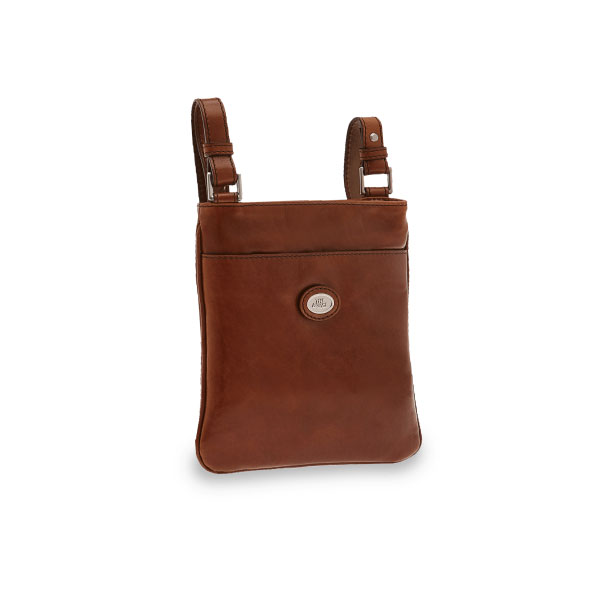Tracolla bandoliera THE BRIDGE linea "Story Uomo" realizzata i cuoio , logo storico in ottone, chiusura con cerniera, tracolla regolabile, cerniera interna porta oggetti. Misure: 22,5x25x2 cm