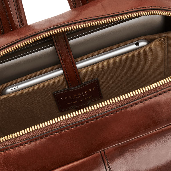 Zaino THE BRIDGE linea "Vespucci" realizzato in cuoio fiorentino, chiusura con cerniera, imbottitura computer e tablet interna, cerniera interna porta oggetti, tasca esterna con cerniera. Misure: 31x38x12 cm