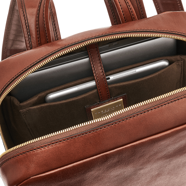 Descrizione: Lo zaino in pelle THE BRIDGE è perfetto per il lavoro e il tempo libero, dotato di imbottitura computer e tablet, cerniera interna porta oggetti, tasca esterna.